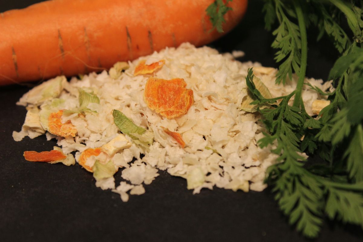 Eine Mischung aus hochwertigen Reisflocken vermischt mit Naturgemüse zur Wurst- oder Fleischfütterung. Hervorragend auch für ernährungssensible Hunde, da die Reisflocken glutenfrei sind. Auch gut geeignet für Hunde, die einen zu dünnen Kotabsatz entwickeln.